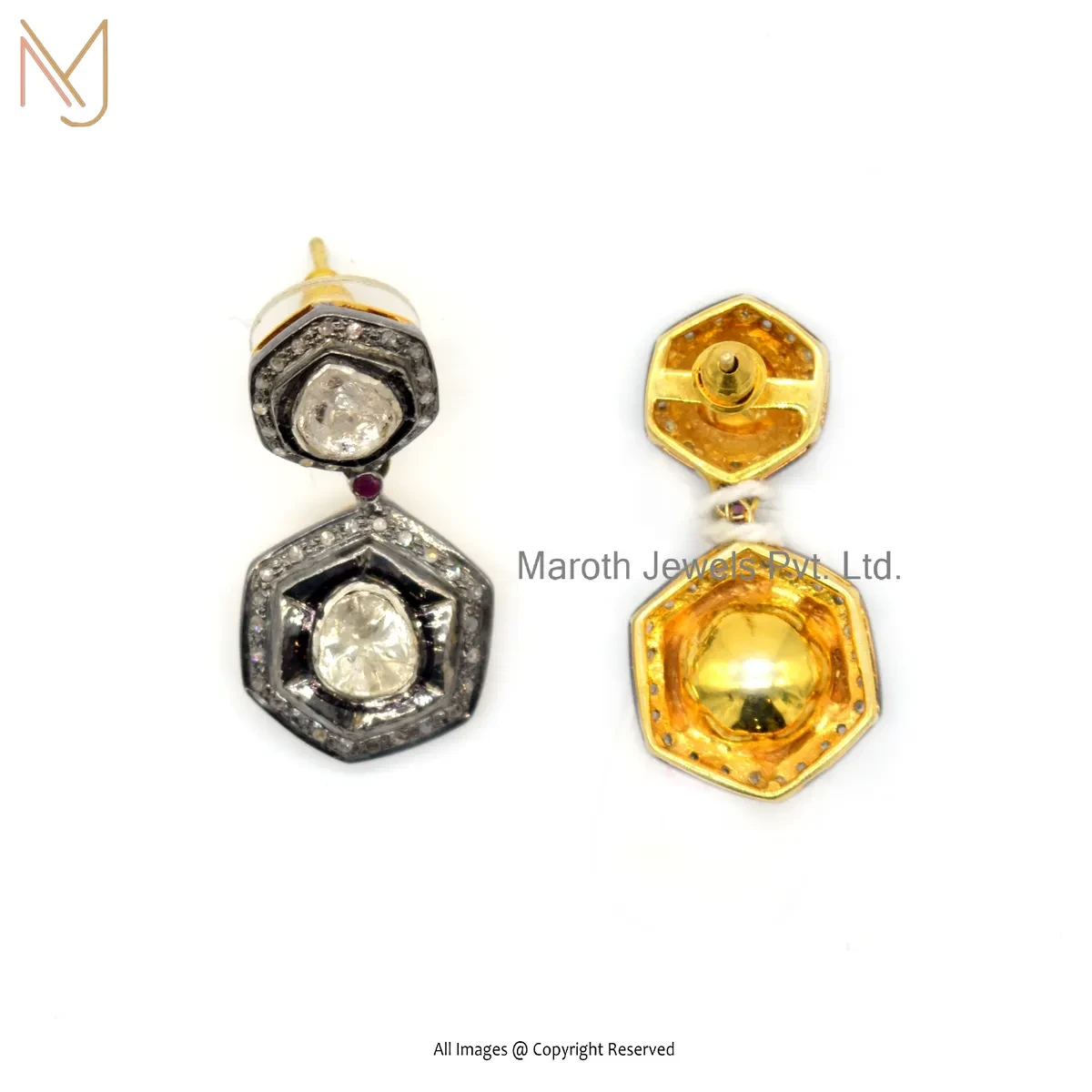 Private Lable 14K Yellow Gold Pave Diamond Rose Cut Polki Diamond Drop Dangle Earring