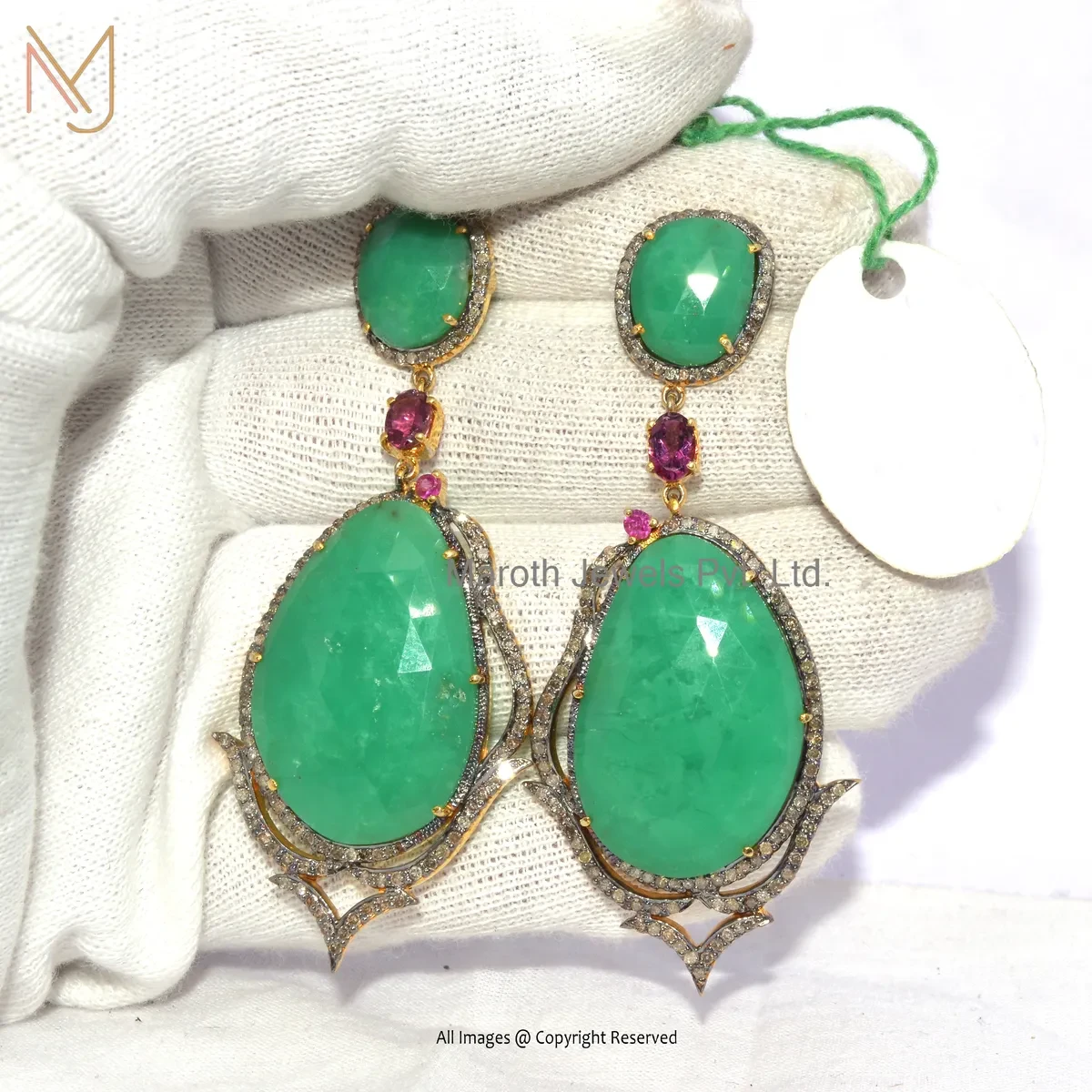 Private Lable 925 Silver Rhodium Yellow Gold Plated Pave Diamond , Green Onyx , Pink Sapphire Gemstone Dangle Earring