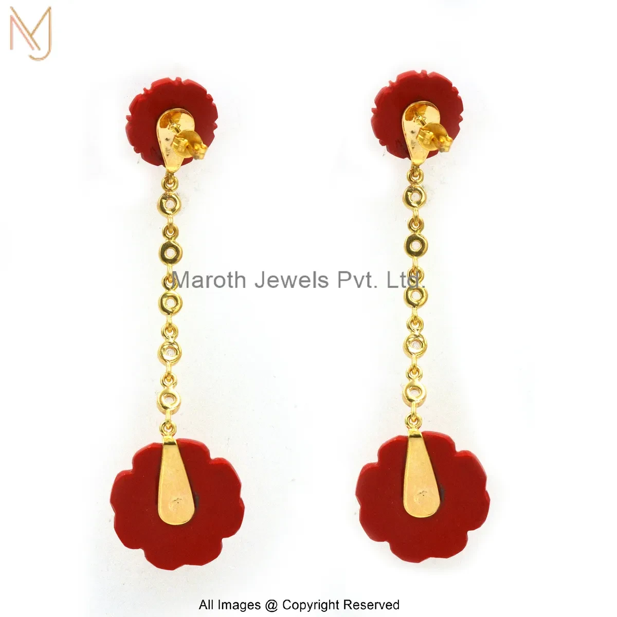 Private Lable 925 Silver Yellow Gold Plated Cubic Zircon Red Coral Carved Flower Dangle Earring