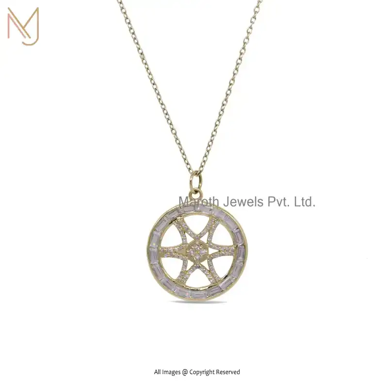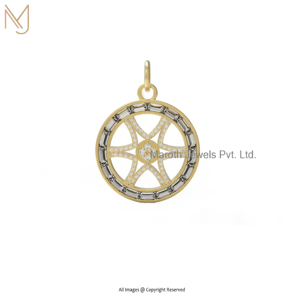 Private Lable 925 Silver Yellow Gold Plated Diamond & White Topaz Baguettes Wheel Star Disc Pendant