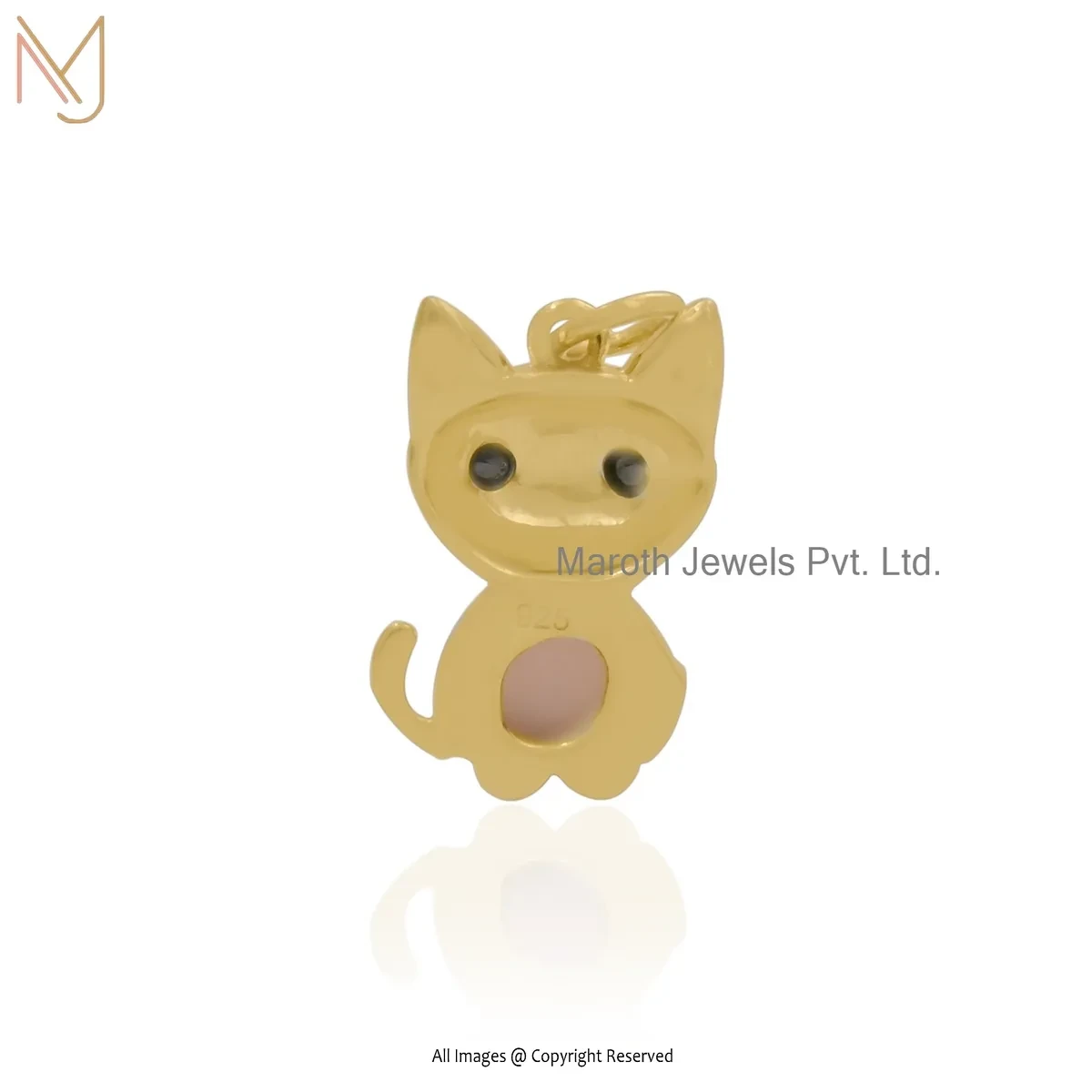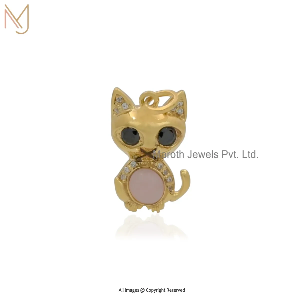 Private Lable 925 Silver Yellow Gold Plated Pink Opal & Black Cubic Zircon Cat Pendant