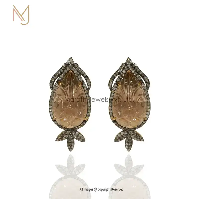 Private Lable 925 Silver Yellow Gold Rhodium Pave Diamond Smoky Quartz Carving Gemstone Stud Earrings