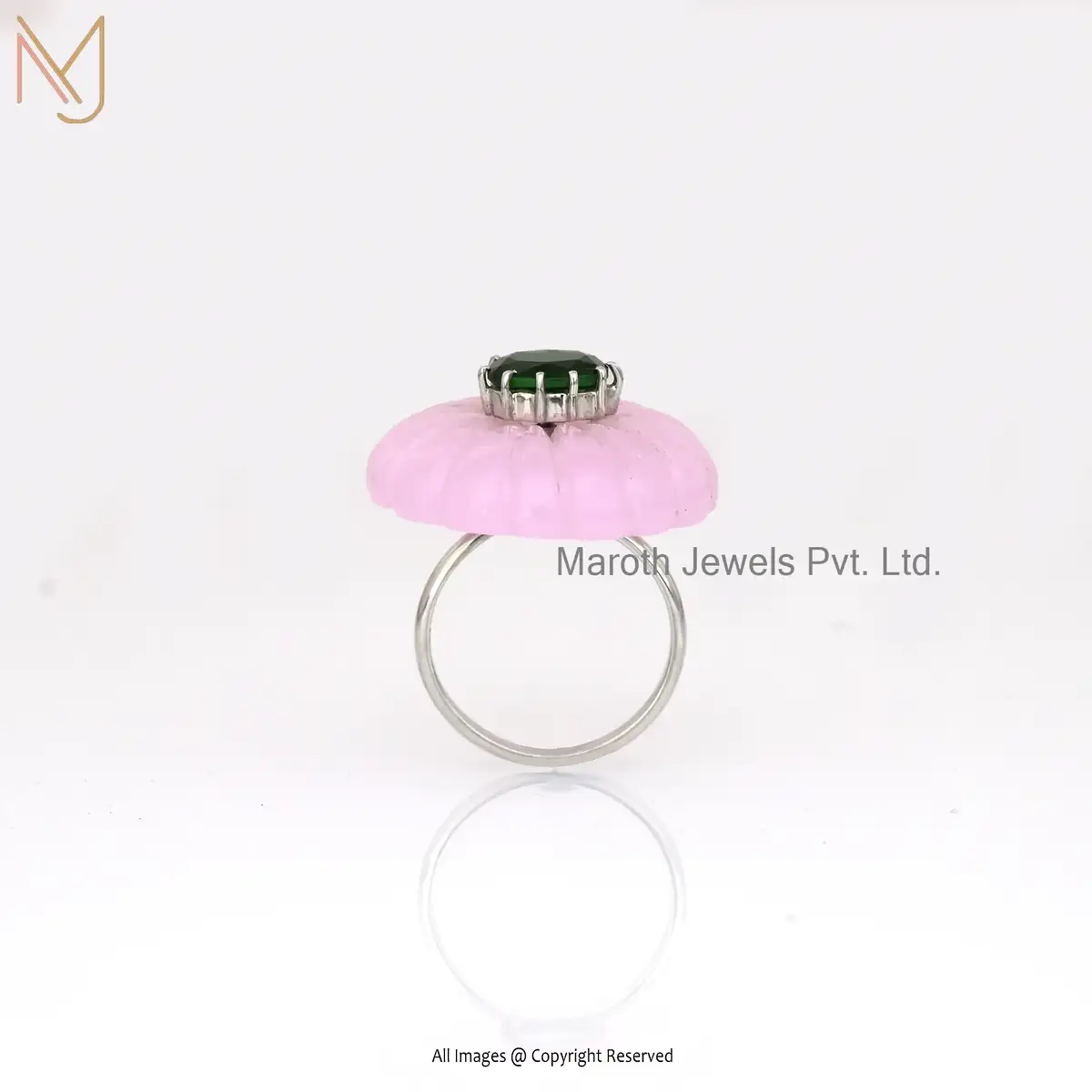 Wholesale 14K White Gold Rose Quartz & Green CZ Flower Ring
