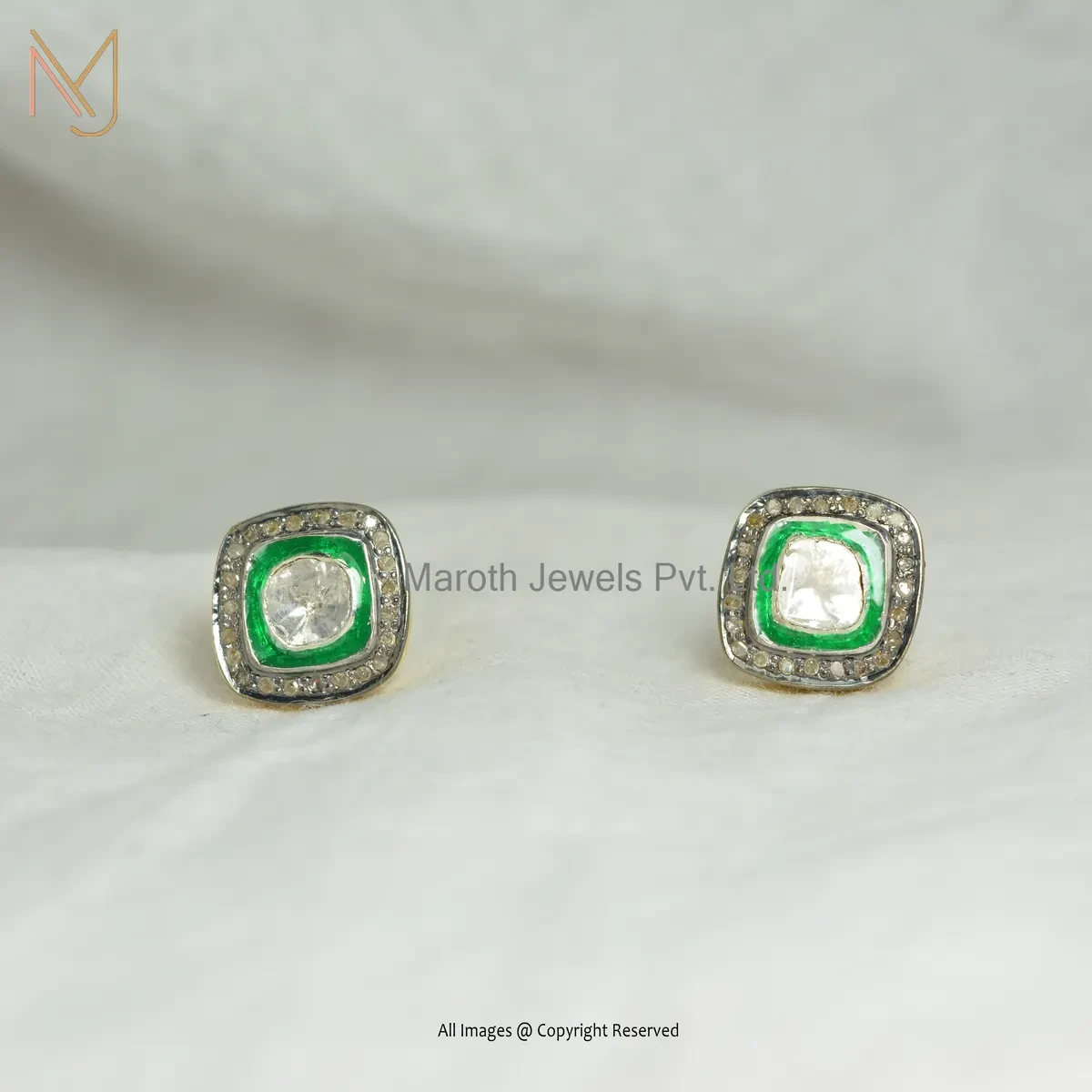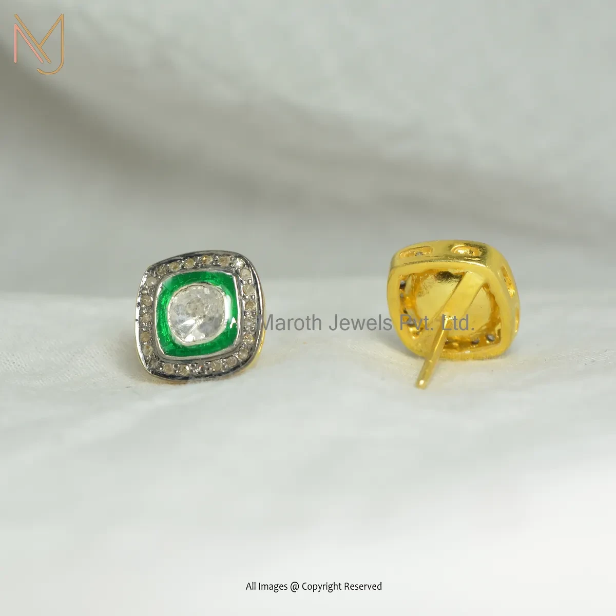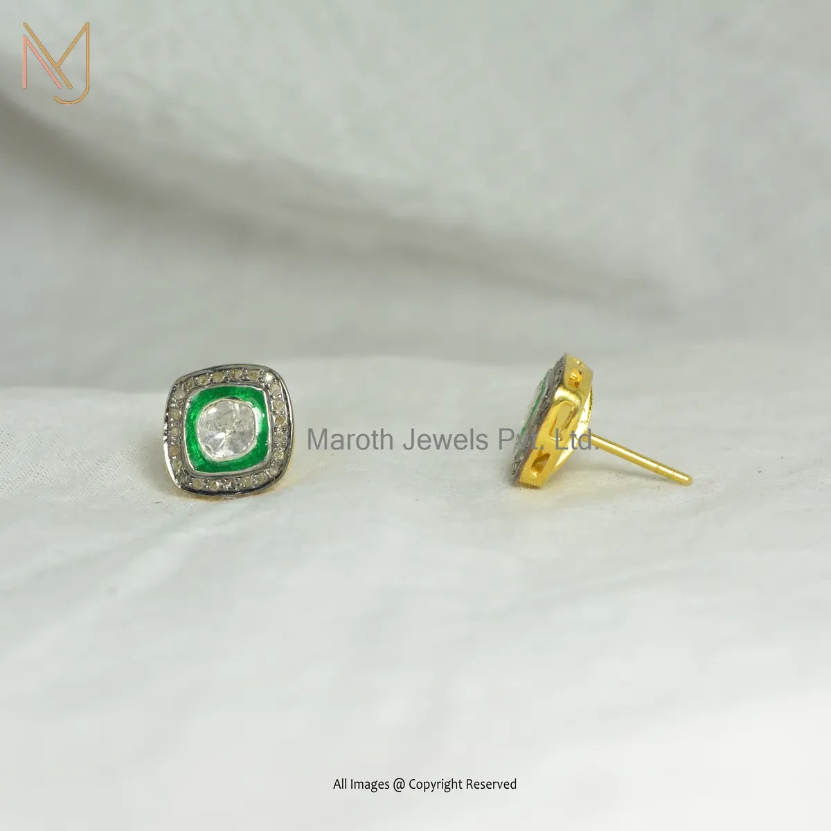 Wholesale 14K Yellow Gold Pave Diamond And Green Enamel Rose Cut Polki Diamond Stud Earring