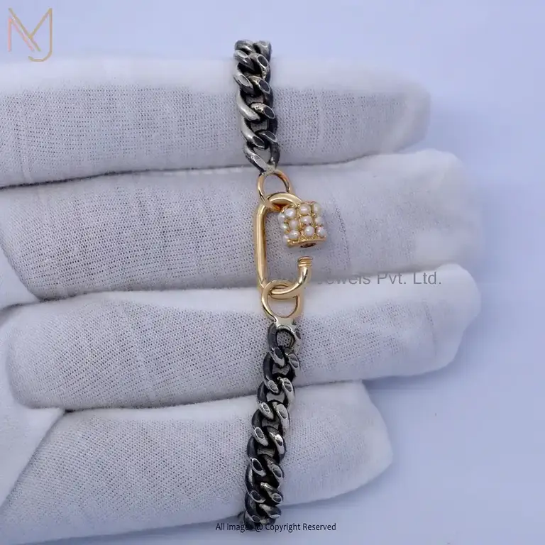 Wholesale 925 Silver Oxidized And Yellow Gold Pearl Curb Bracelet Jewelry