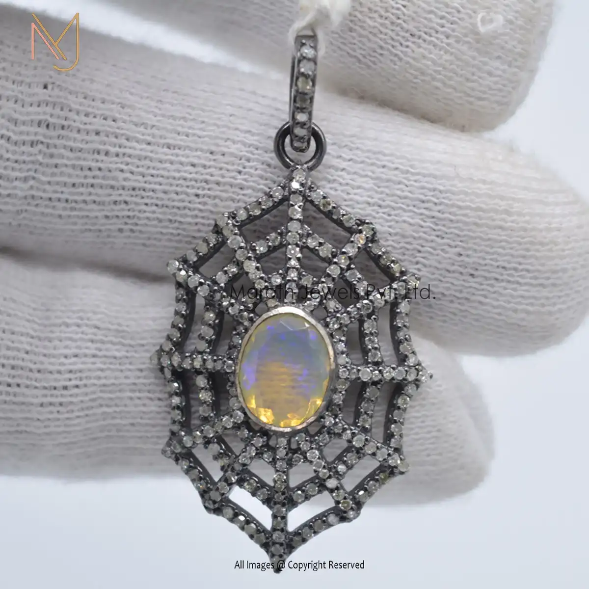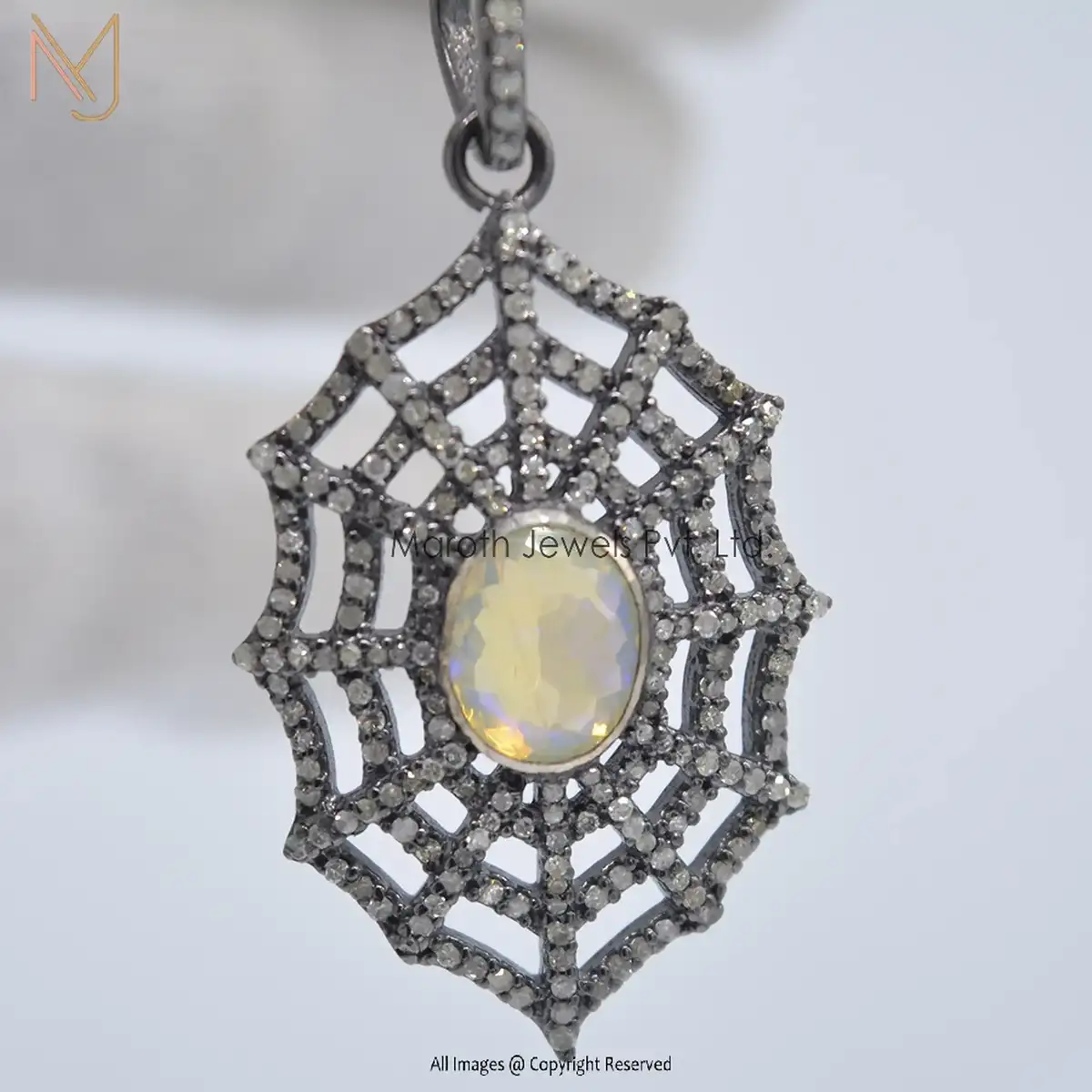 Wholesale 925 Silver Rhodium Pave Diamond Web Spider Opal Gemstone Pendant