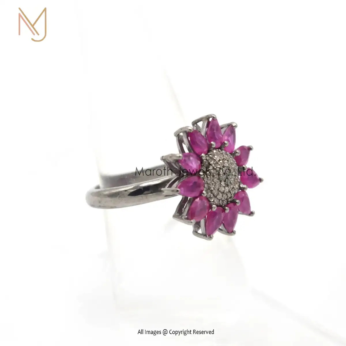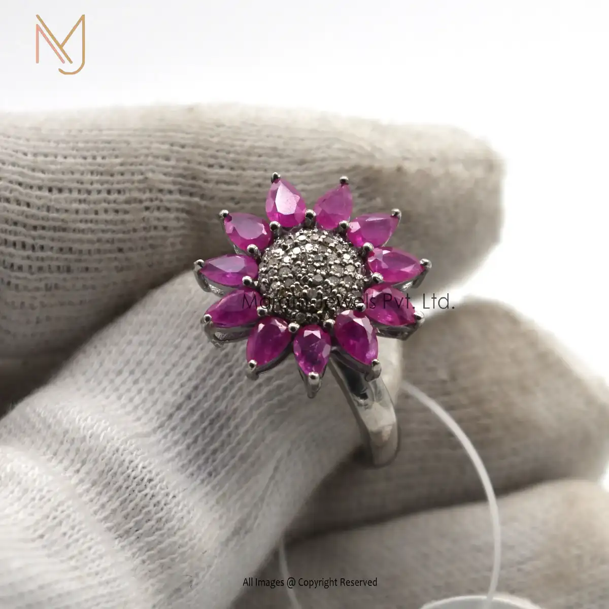 Wholesale 925 Silver Rhodium Plated Pave Diamond Ruby Gemstone Flower Ring