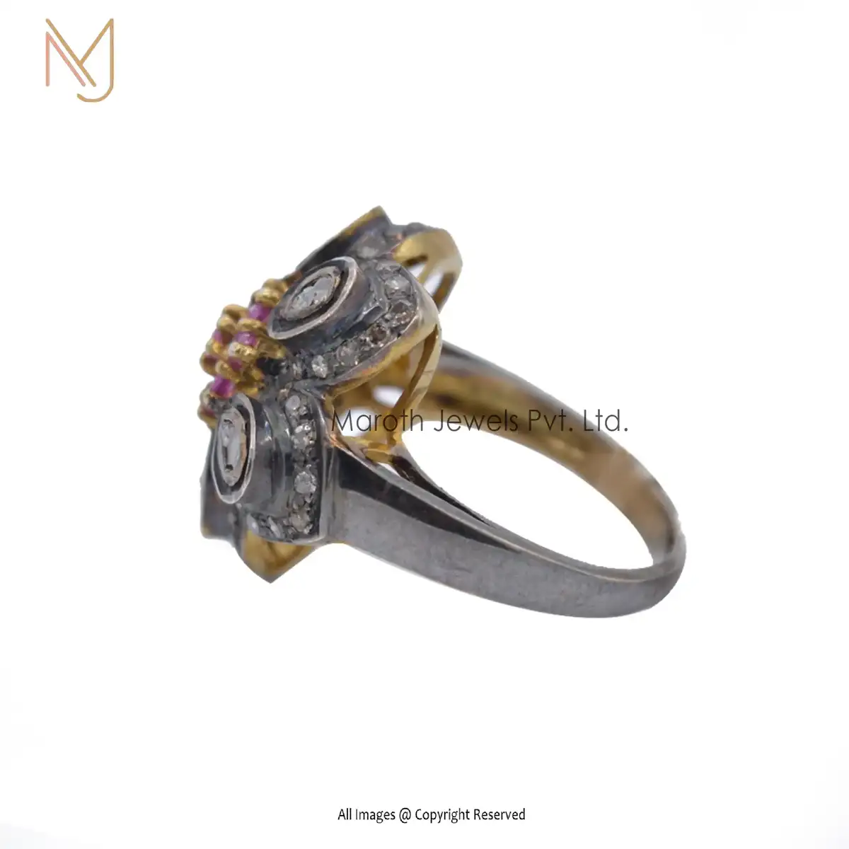 Wholesale 925 Silver Rhodium Yellow Gold Pave Diamond Ruby Gemstone & Rose Cut Diamond Ring