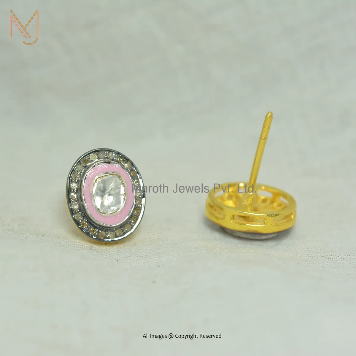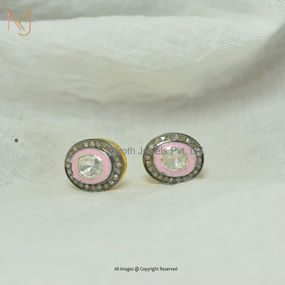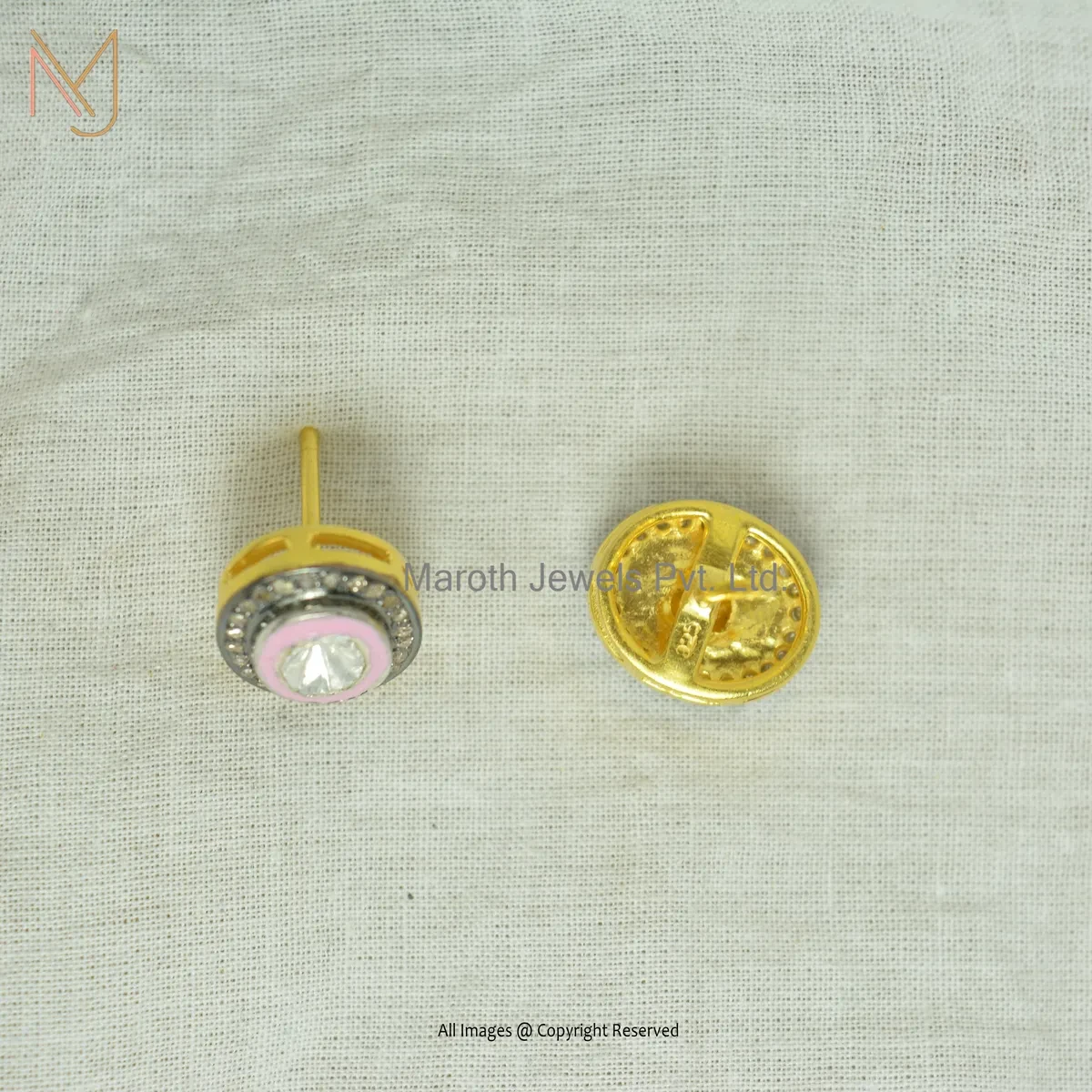 Wholesale 925 Silver Rhodium Yellow Gold Plated Pave Diamond Pink Enamel Rose Cut Polki Diamond Stud Earring