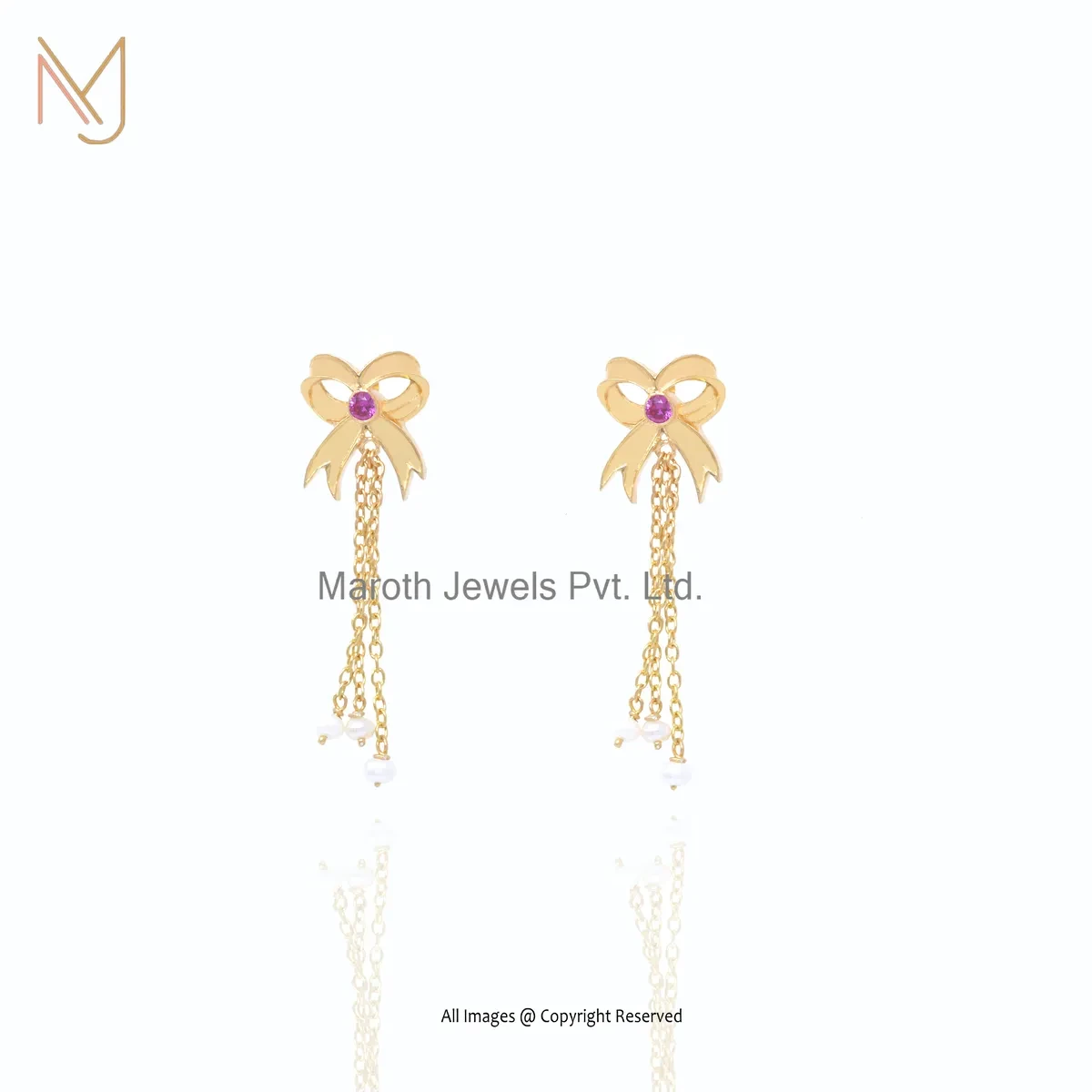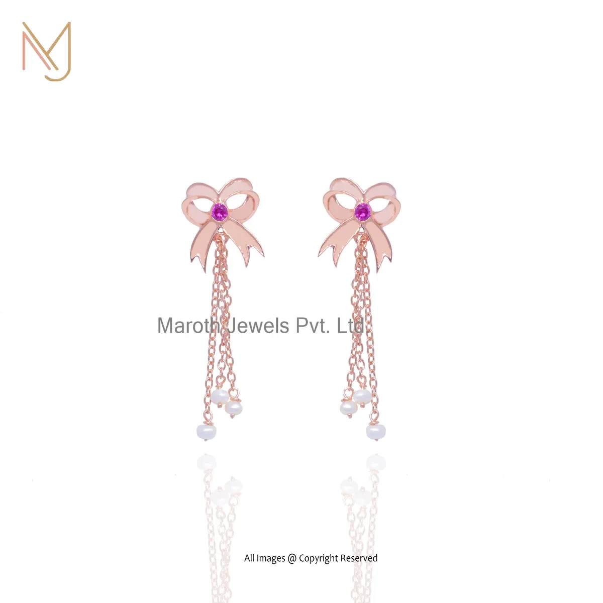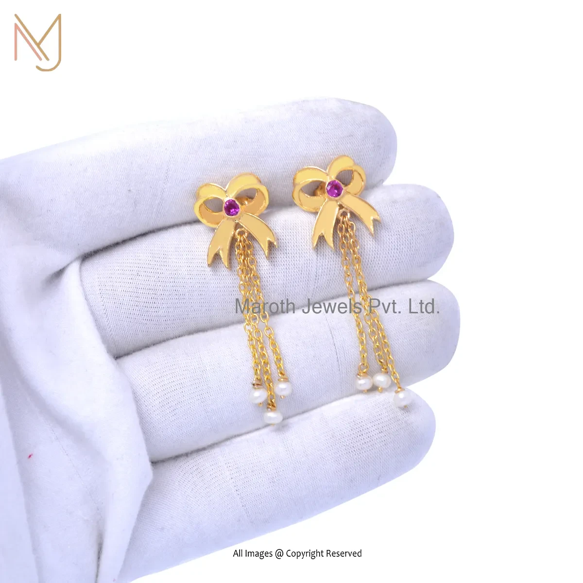 Wholesale 925 Silver Yellow Gold Plated Pink Cubic Zircon Pearl Gemstone Chain Drop Earring